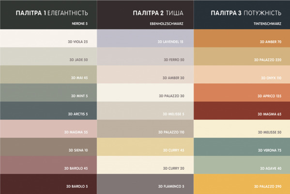 Наше повсякденне життя повне вражень і очікувань. Тому ми прагнемо більшого миру та спокою, збалансованого впливу різних факторів на наше життя і визначення, що насправді відіграє у ньому найважливішу роль. Наші тренд-скаути відфільтрували три з ключових життєвих тем і розвинули їх у колекціях відтінків для дизайну інтер’єрів. Обрані добірки можуть легко змінюватись всередині себе в залежності від того, що задає основний тон.Оскільки ми з таким ентузіазмом ставимося до цих палітр, ми навіть розробили нову поверхню для кожної з них.