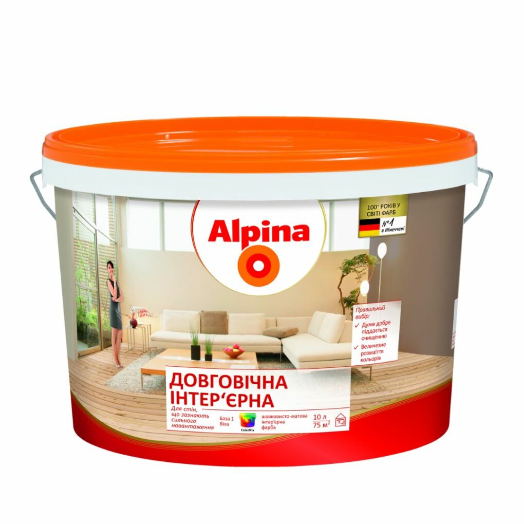 Alpina Довговічна інтер’єрна — це шовковисто-матова дисперсійна фарба, яка завдяки величезному розмаїттю відтінків дозволить кожному знайти тон на свій смак. Володіючи чудовою здатністю до очищення, ця фарба дозволяє створити в житлових і робочих приміщеннях з високими поверхневими навантаженнями оптимальним чином захищені і довговічні поверхні.